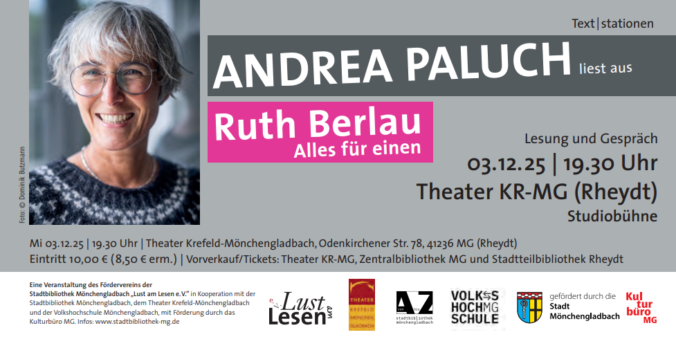 Eine Veranstaltung des Fördervereins der Stadtbibliothek Mönchengladbach „Lust am Lesen e.V.” in Kooperation mit der Stadtbibliothek MG, dem Theater Krefeld-Mönchengladbach und der VHS MG, mit Förderung durch das Kulturbüro MG. Infos: www.stadtbibliothek-mg.de