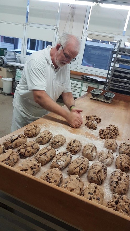 Hans Oehmen, Konditormeister im Ruhestand, hat exklusiv für den Verkauf am kommenden Samstag seinen Bäckerkittel erneut angelegt und eine Backstube (Bio-Bäckerei Kabauter in Duisburg) aufgetan, die ihm ermöglicht, den hochwertigen Bio-Christstollen herzustellen.